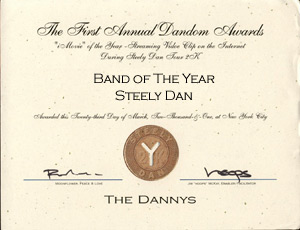 created 2.20.01/ last update 8.12.01 1:10 nyc time page ©2001 jim mckay ; "steely dan subway token" logo on award certificate ©2000 steely dan. all rights reserved "The Dannys" and "Danny" are trademarks. |